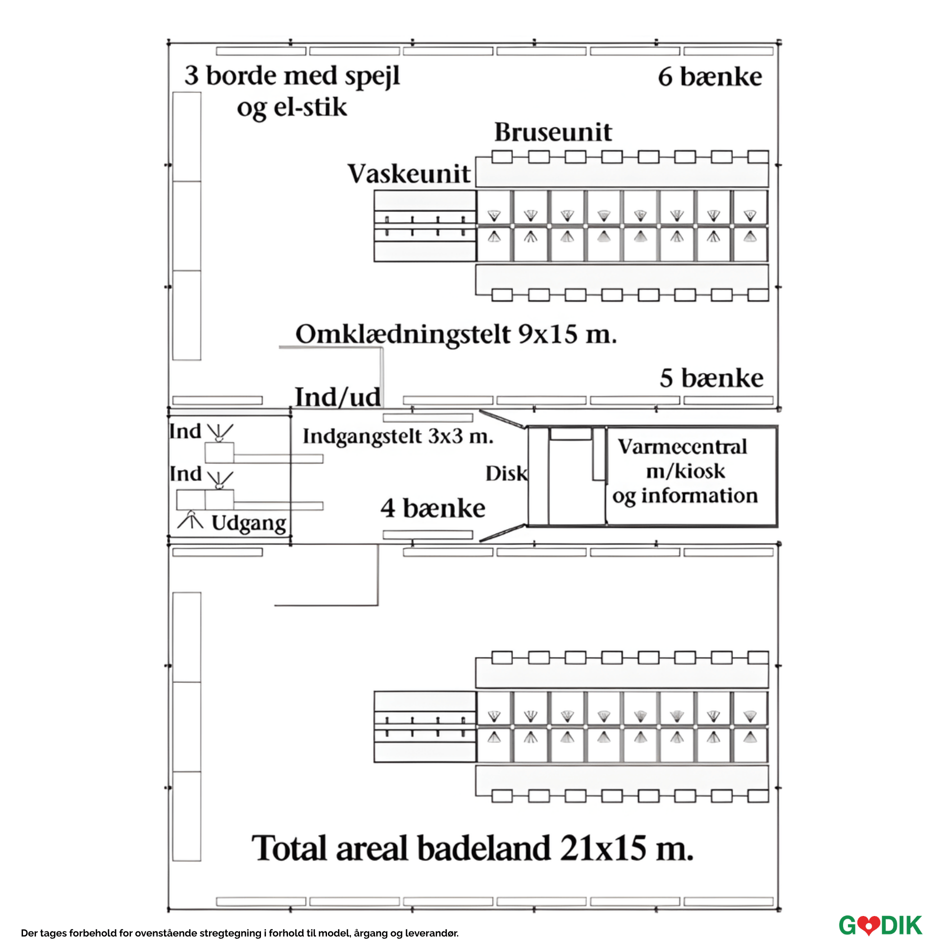 Produktet består af 2 stk. bruseunit med 16 kabiner, gangbro, 2 stk. badetelte 9x15 m, 1 stk. indgangstelt, 6 borde m/ spejl, 26 bænke, plastgulv, 2 stk. vaskeunit med spejl, 2x8 vandhaner med tempostop, overhylde for toiletartikler, 3 stk. ind- og udgangsmøller, oliefyscentral og oliefyr med tank.