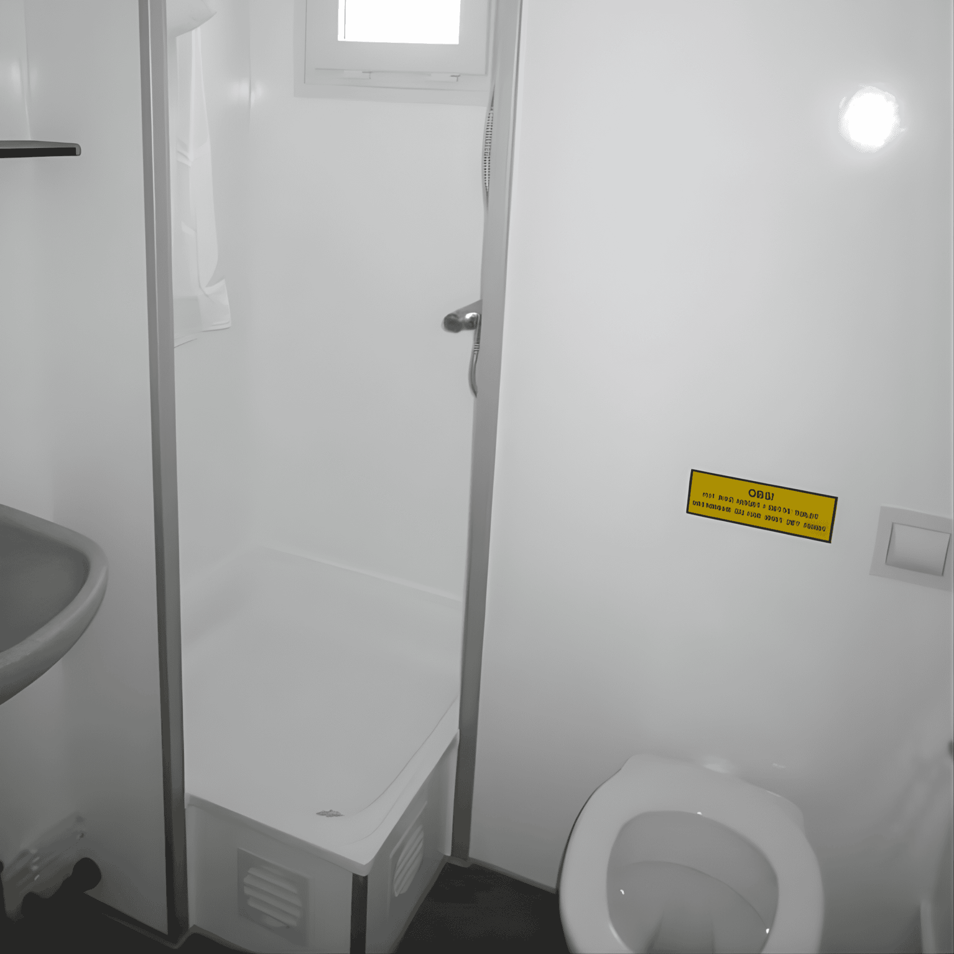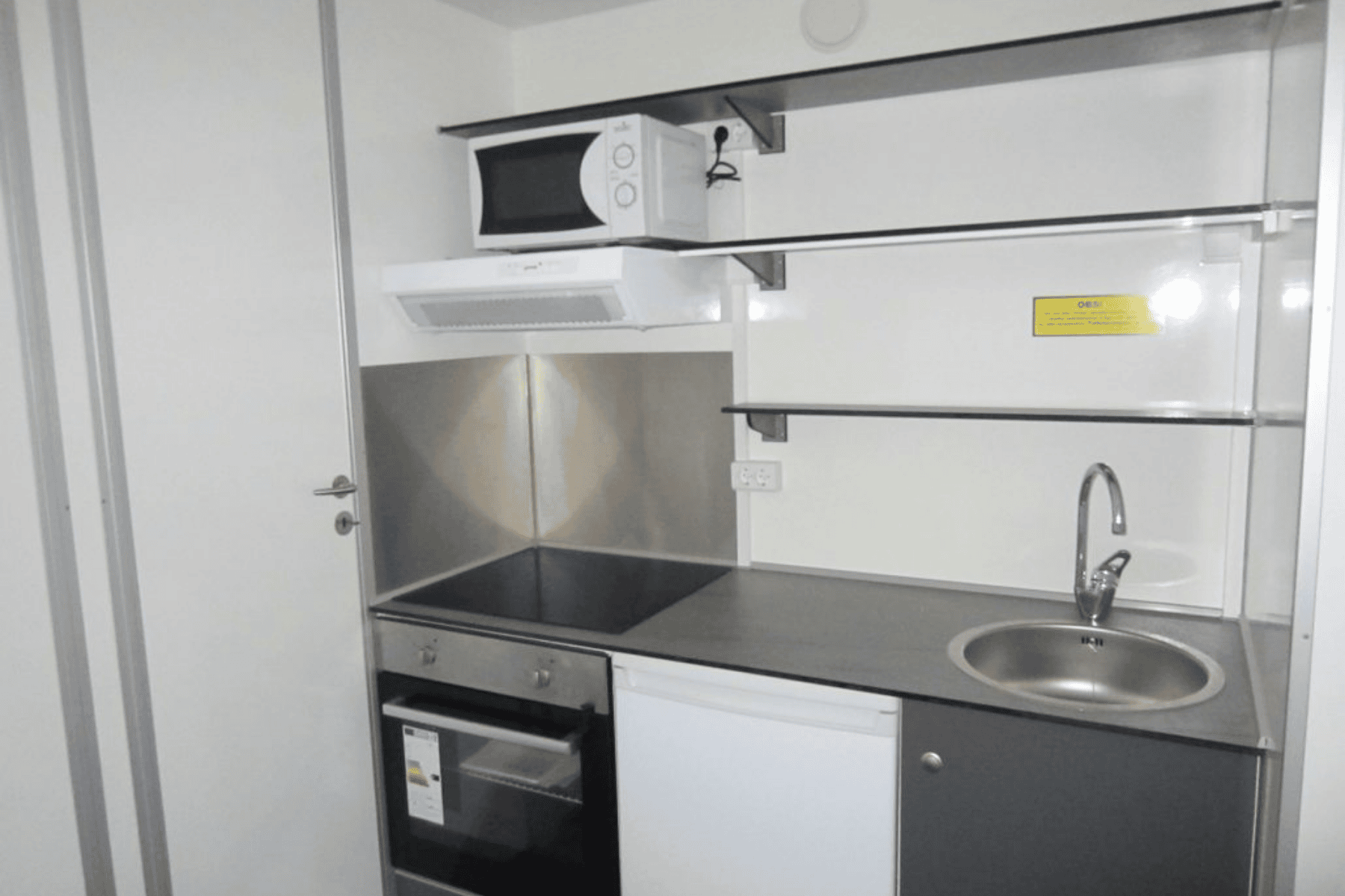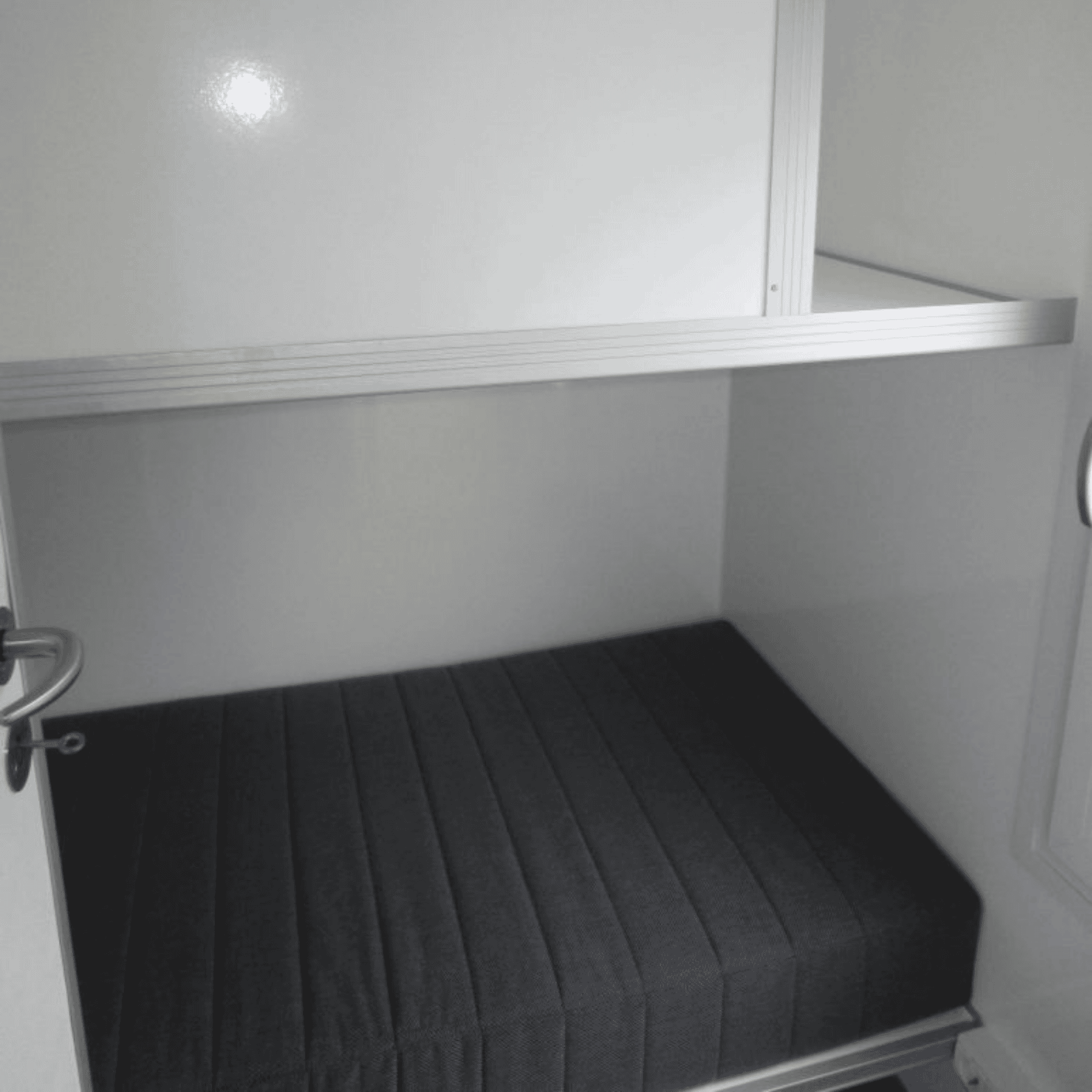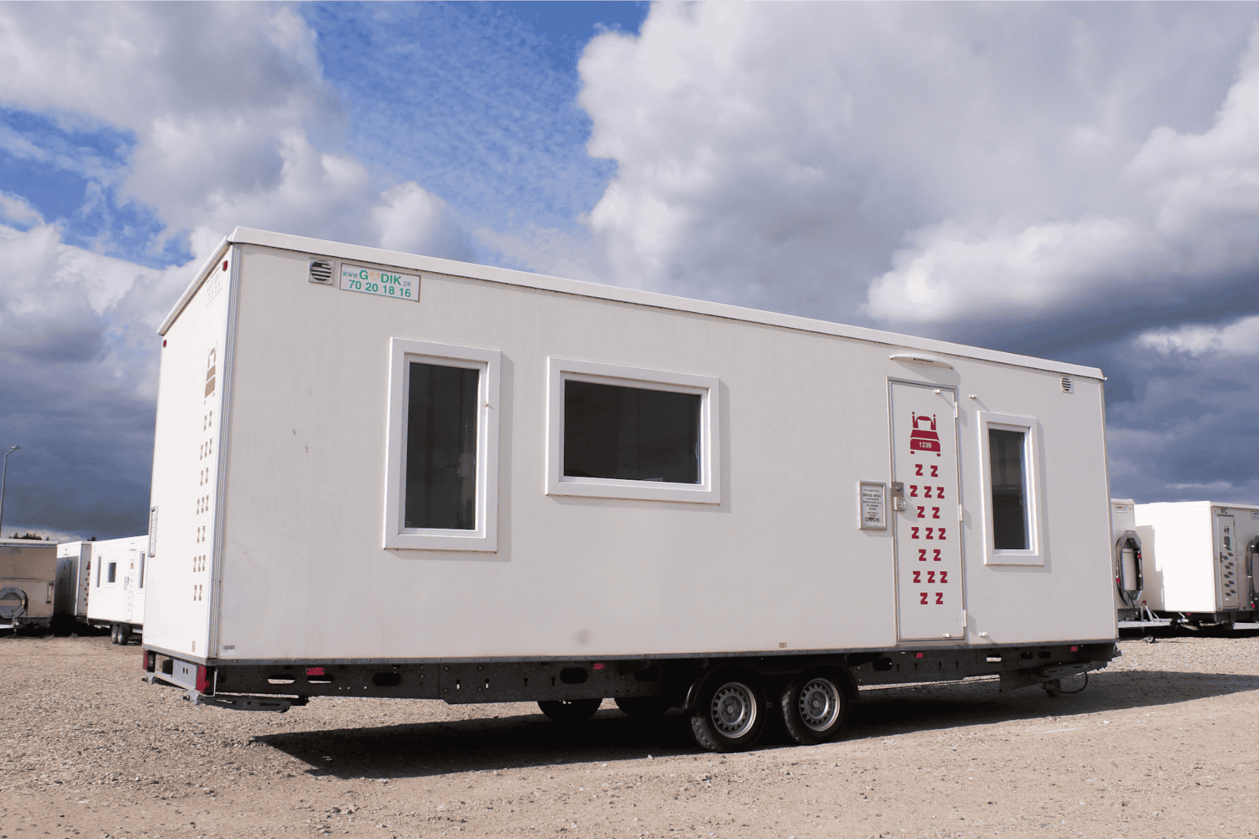 Robust beboelsesvogn til håndværkere med fire individuelle sovepladser, køkken og bad. Designet til praktisk brug og hurtig opsætning.