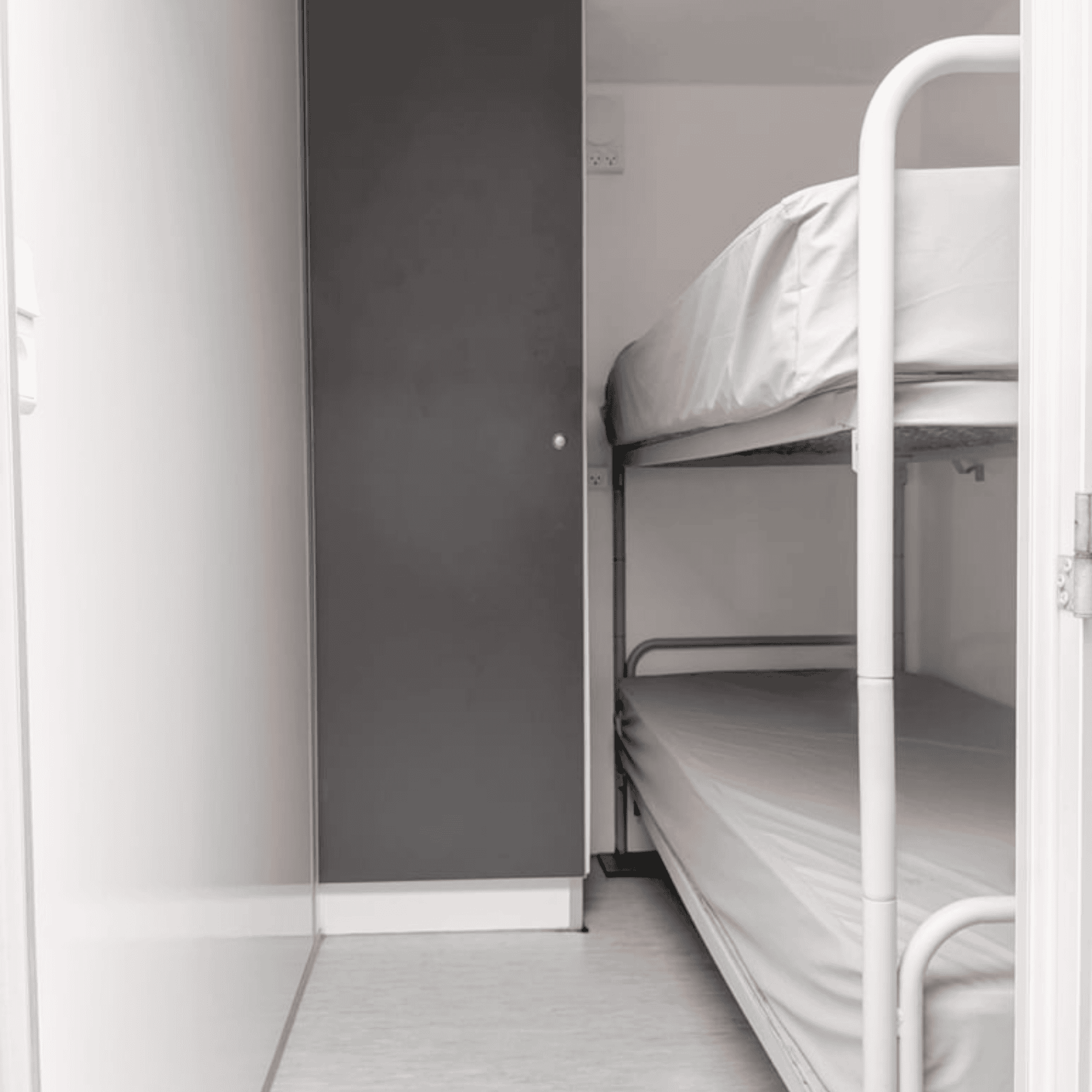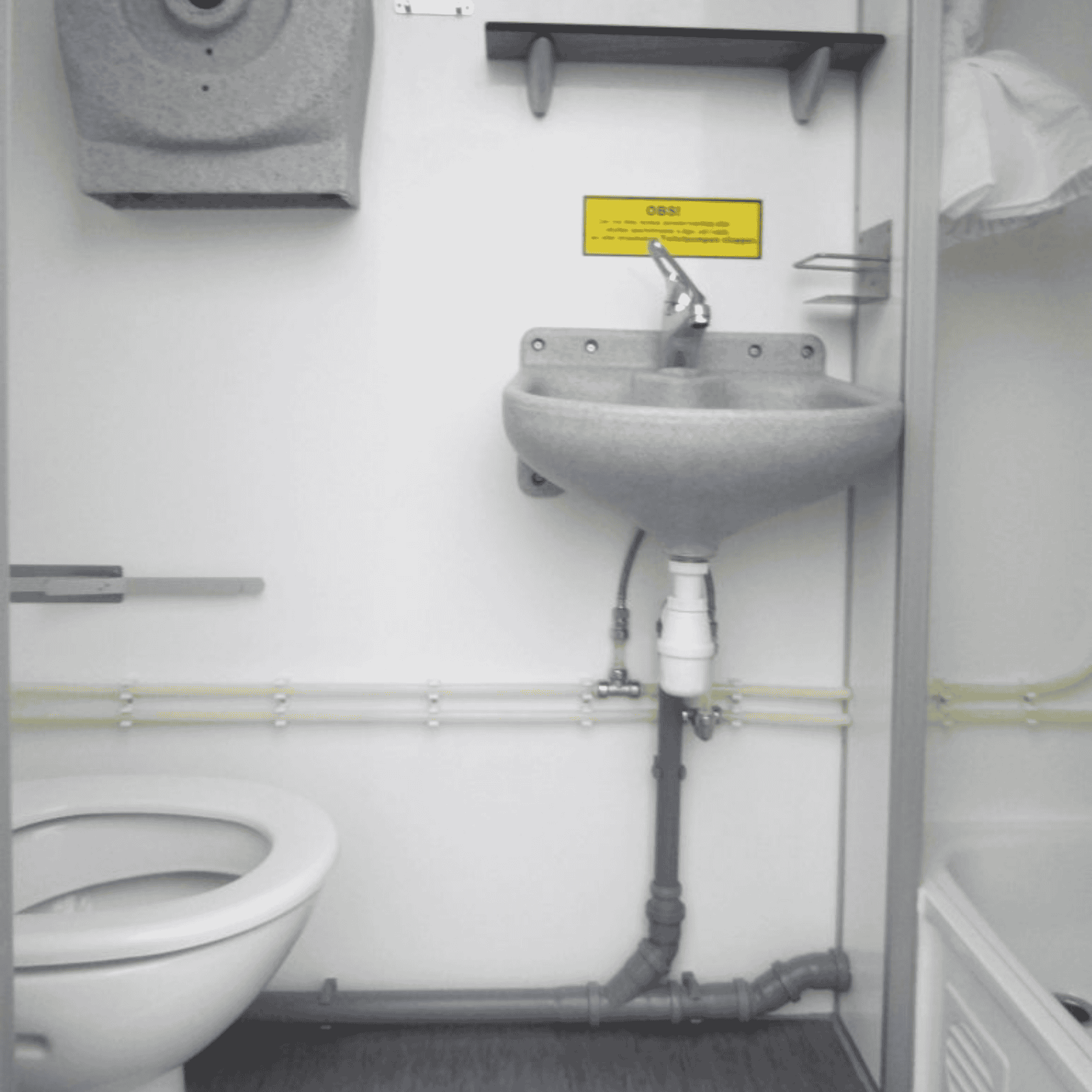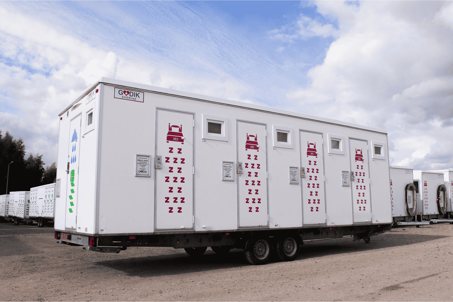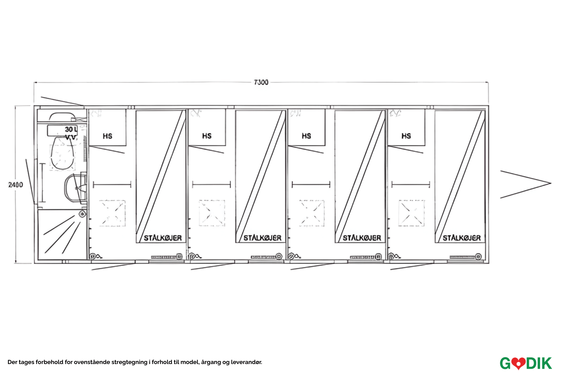 Stor beboelsesvogn med plads til otte personer. Perfekt til større crew- eller mandskabsområder. Leveres med badeværelse.