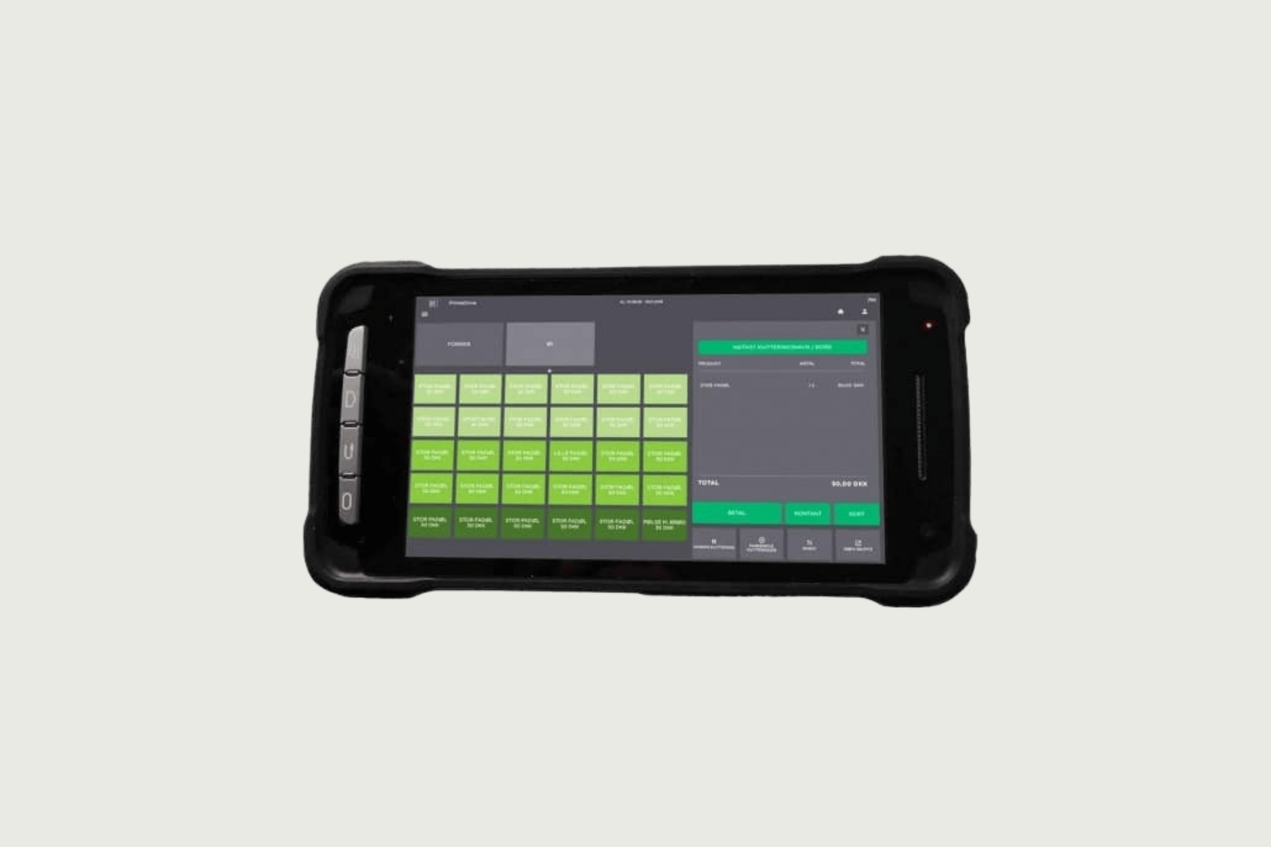 Koblet via mobilnet 4G /Wifi. Oplyst tastatur. Batteribackup. Farveskærm. Kontaktløs (NFC), armbånd, personalekort og gavekort. Lade kabel. Op til 8 timers brug pr. opladning. Stregkode og QR scanner.