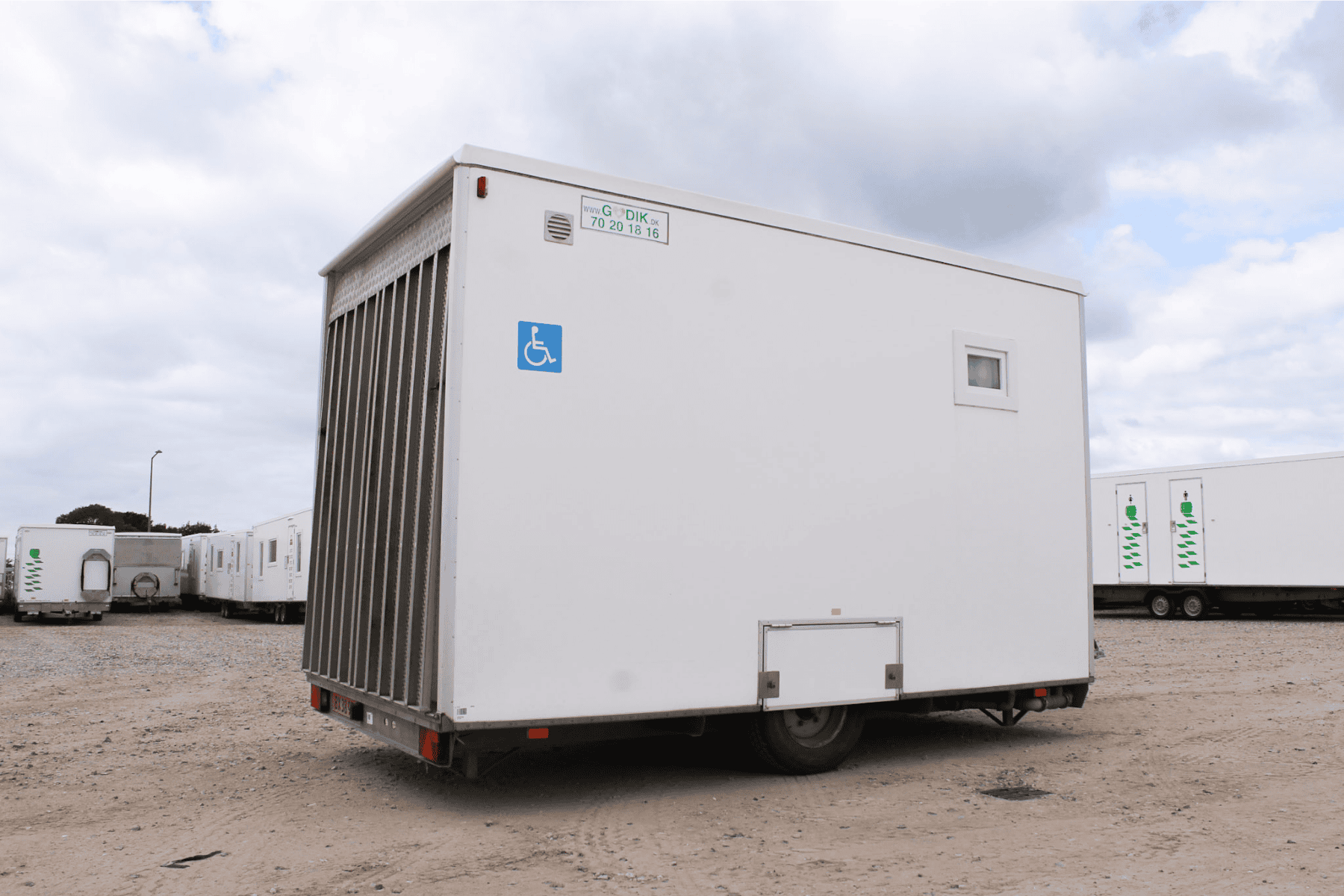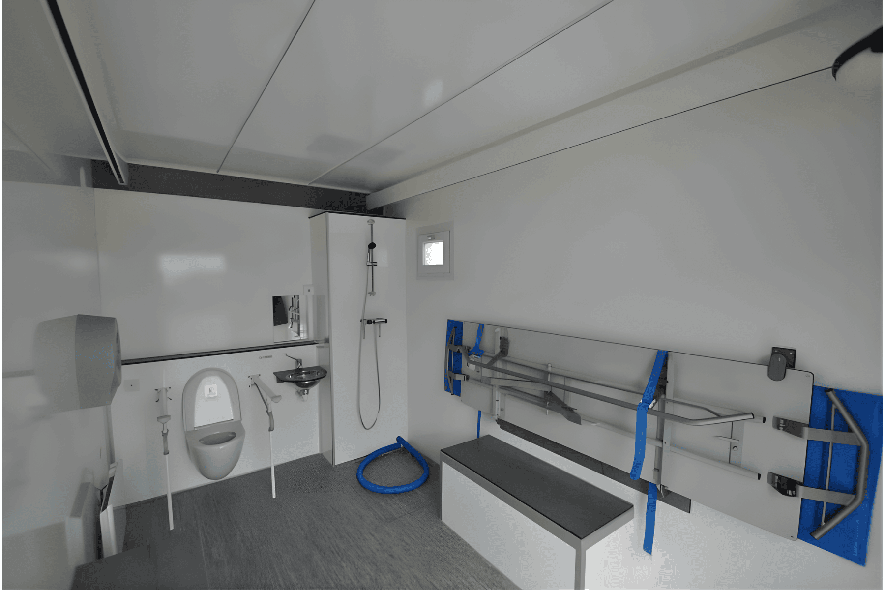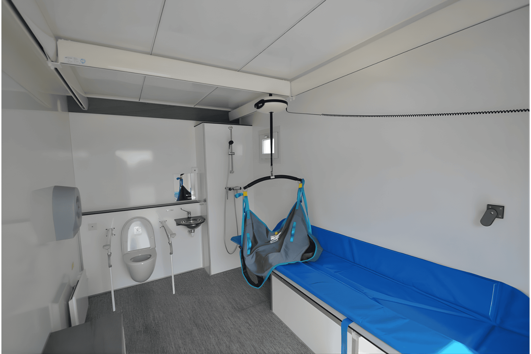 Toiletvogn u. tank/ til tilslutning med handicapvenligt toilet m. vacuumskyl. Inkl vaskebord, bad og travers lift. Med sænkbar aksel