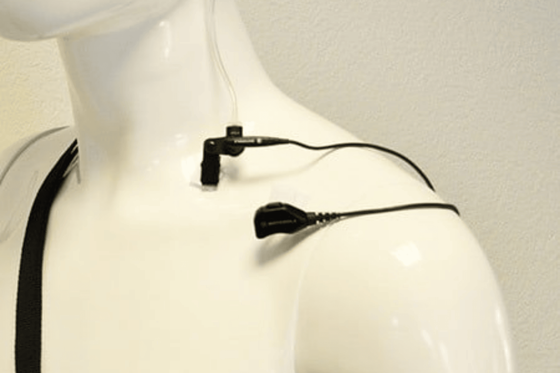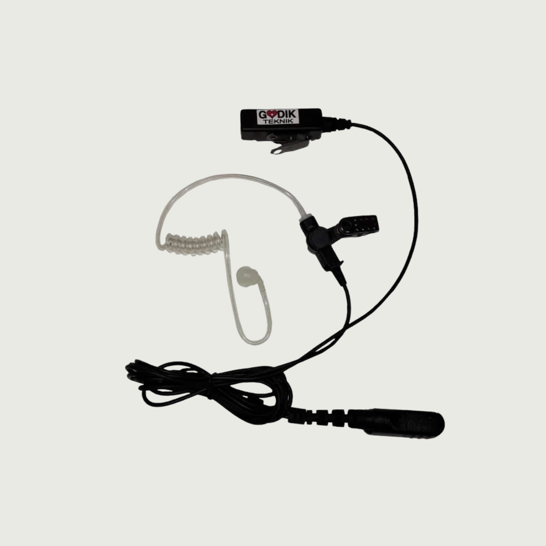 Øresnegl med spiral, mike og tasteknap med kraveclips. For digital radio.
