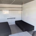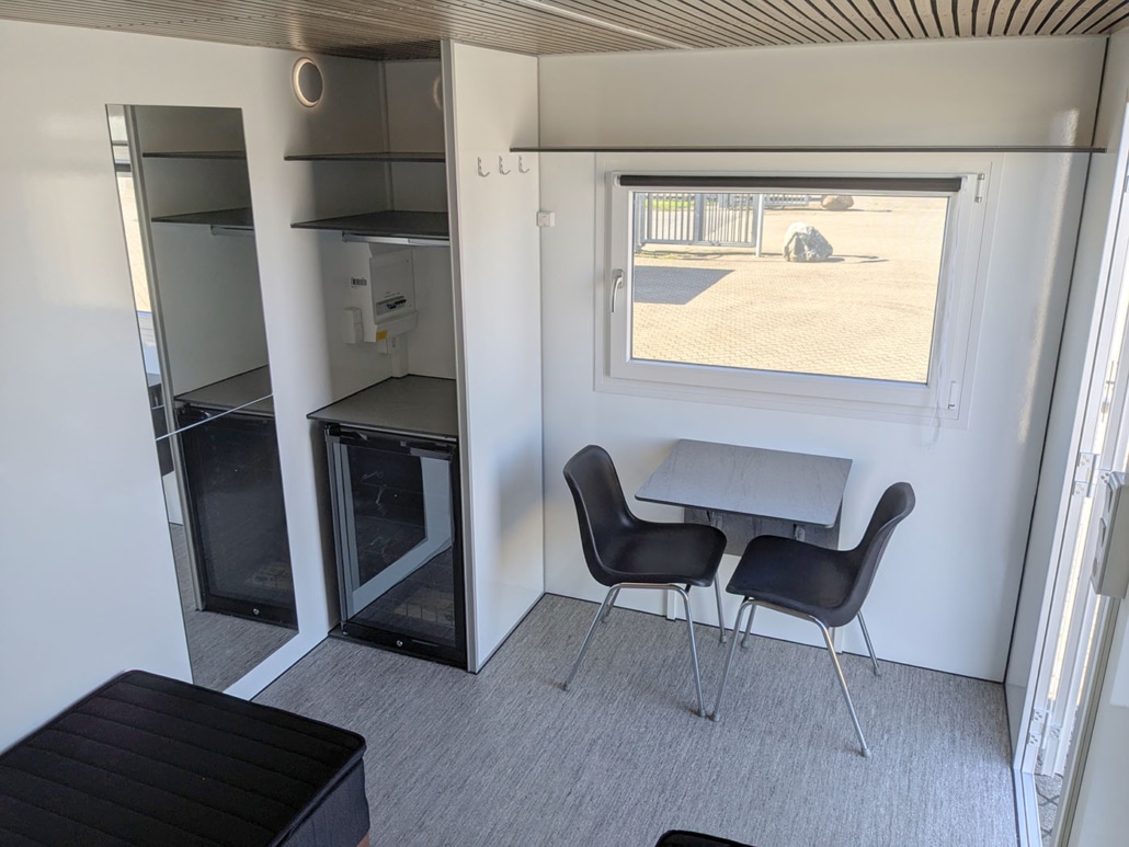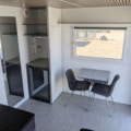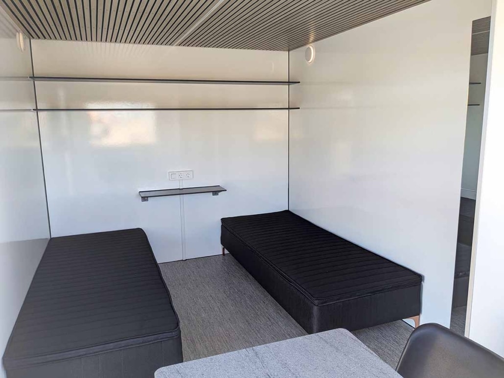 - Inventar: Lys LED indv. og udv. lys med sensor, 2 stk. boxmadrasser, køleskab, 2 stole, klapbord, hylder, 5 knager, lyddæmpende loftbeklædning og gulvvarme.