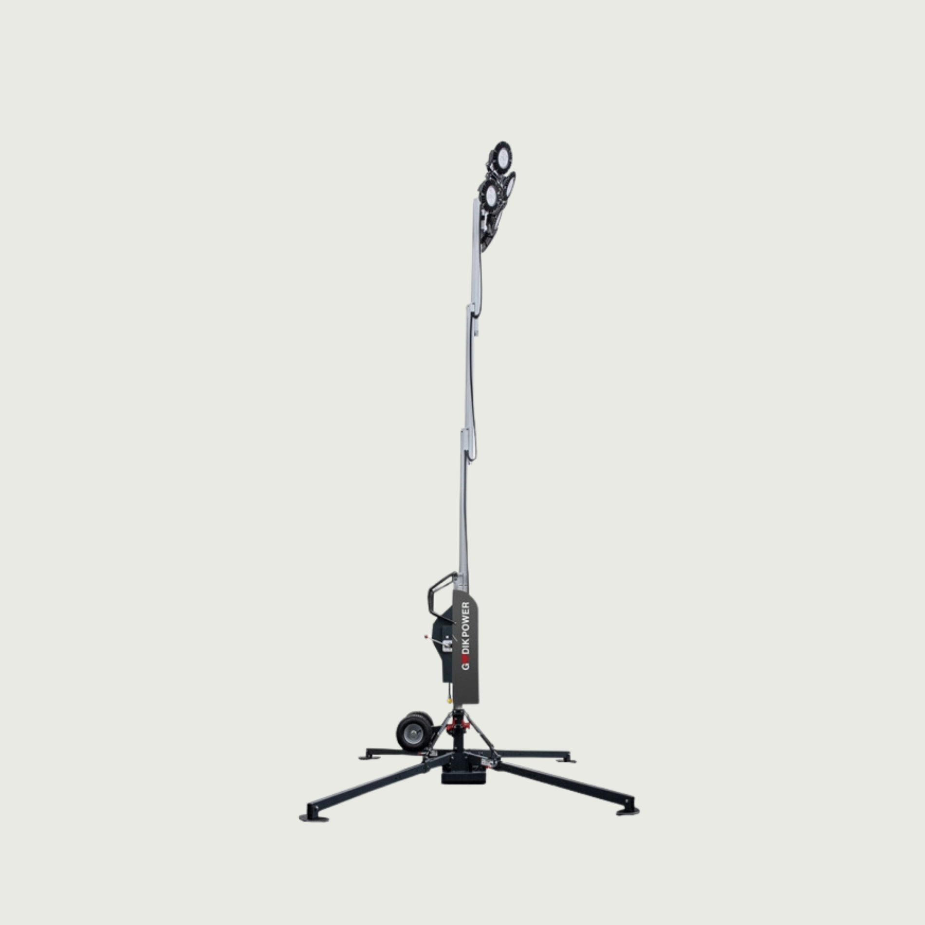 Kraftig LED-lysmast med 6 lamper og 360° belysning. Masten kan hæves til 6,5 meter og giver op til 244.800 lumen. Let at transportere med gaffellommer og hjul – ideel til byggepladser, events og midlertidige installationer, hvor stabil og effektiv belysning er afgørende.