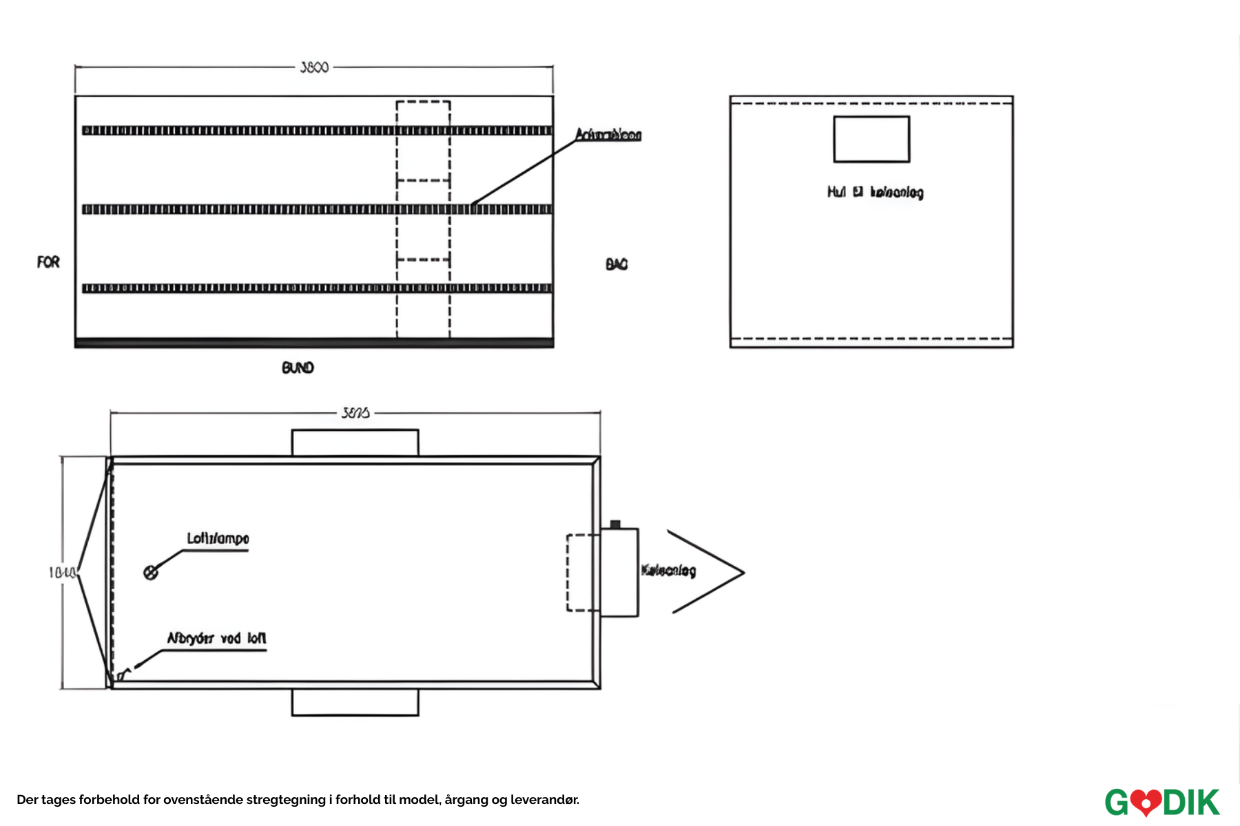 - Højde mål: Model 1: udv. 265/indv. 200. Model 2: udv. 248/indv. 181 cm. Længde mål: Model 1: udv. 395/indv. 378. Model 2: udv. 420/indv. 408 cm. Bredde mål: Model 1: udv. 185/indv. 170. Model 2: udv. 234/indv. 170 cm. Opstilling: Trailer skal stå lige/i vater.