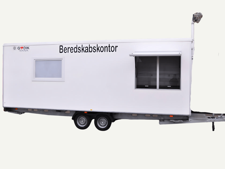 Beskrivelse Produktionsvognen er udstyret med 1 skrivebord med 2 overhylder, 2 stole, gulvgennemføring til kabler, 1 affaldsspand,dankortterminaler, klapbordplade med 2 overhylder med plads til en flightcase, f.eks. med en Motorola anlog repeater,40 stk. elstik foroplader til radio. Inventar i køkken/opholdsrum Køkkenhøjskab, flaskekøler, kaffemaskine, mikroovn, vask med afløbskværn, 1 affaldsspand, hjørnesofa/dobbeltseng, tv. Inventar i lagerrum 2 hylder på 3 sider. |