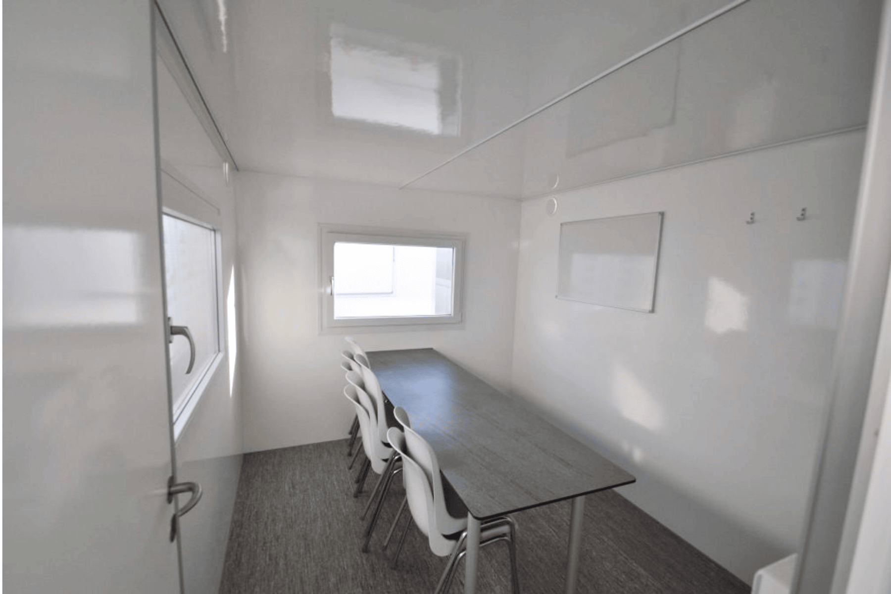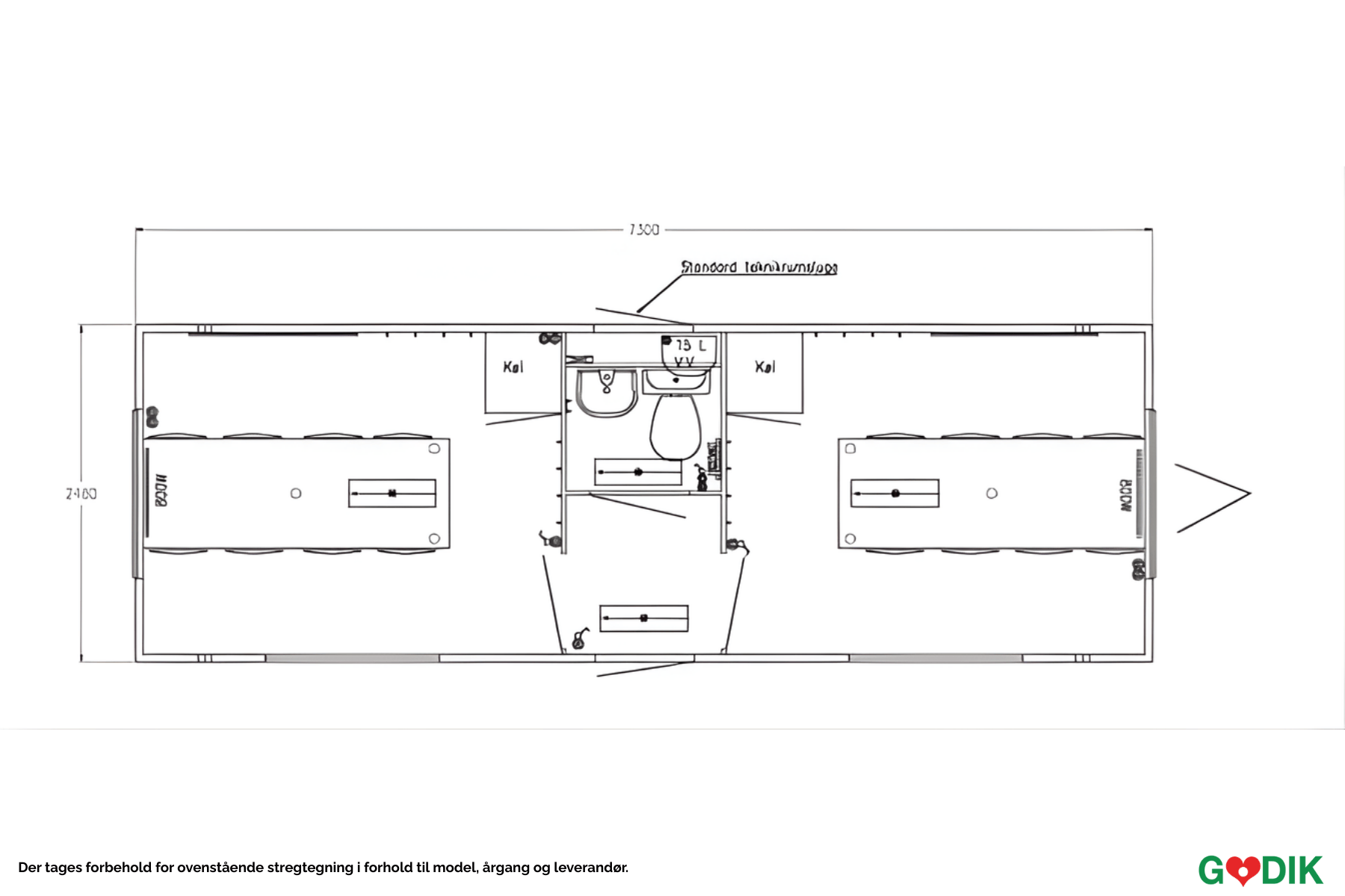 Kontorvogn med praktisk opdeling i to separate rum – ideel til afdelinger eller møderum. Vognen indeholder toilet og håndvask.