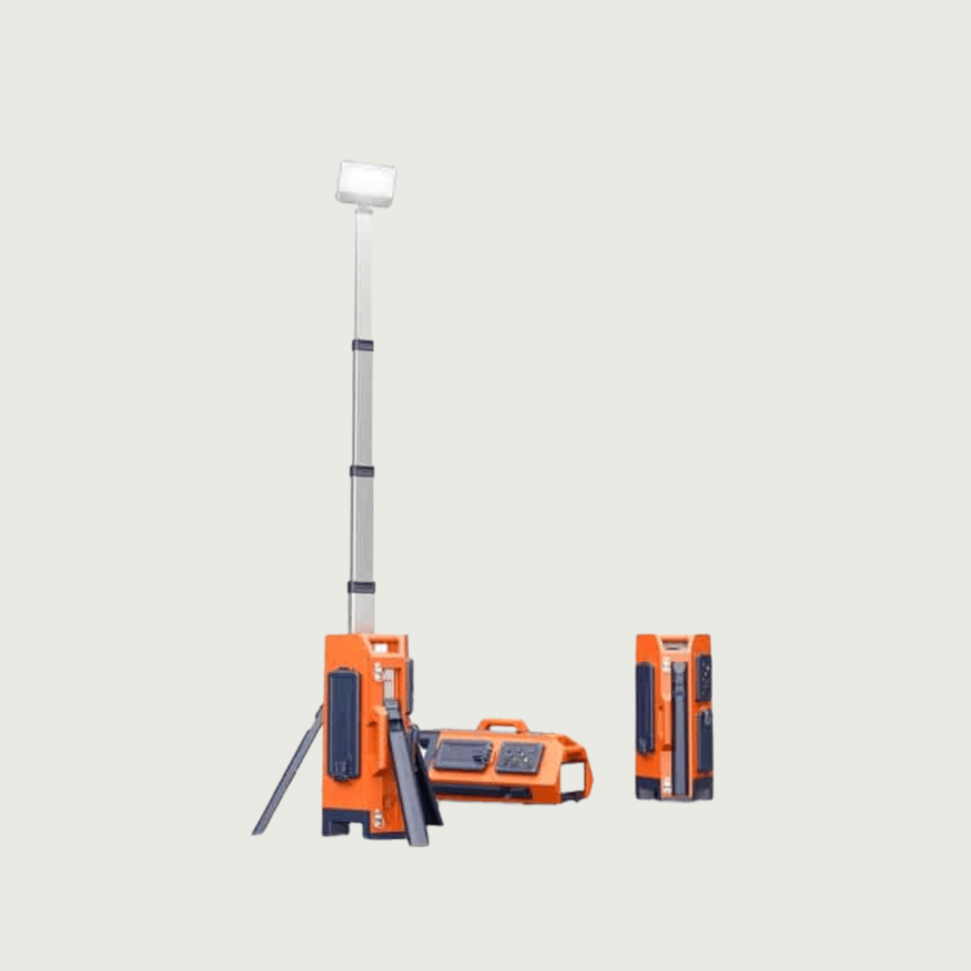 Kompakt LED-lystårn med tre udskiftelige batterier og oplader. Lyser op til 10 timer afhængigt af brug, og leveres klar til drift med 230V stik. Velegnet til oplysning af mindre områder, byggepladsrum og mobile installationer.