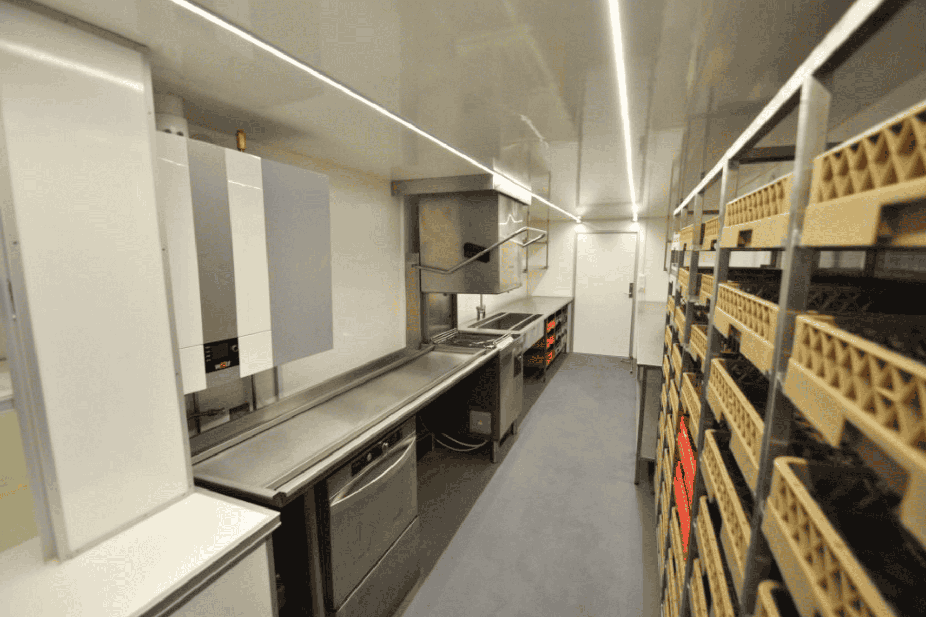 Mobil opvaskevogn til events og midlertidige storkøkkener – effektiv og hygiejnisk løsning med plads til industriopvask.