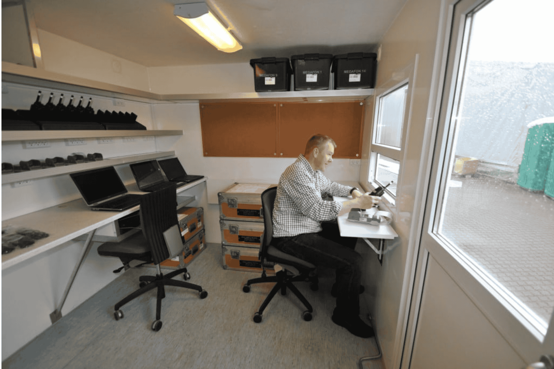 Godiks produktionsvogn giver dig fuldt kontrolrum på hjul – med GPS-sporing af medarbejdere, mulighed for overvågning og komplet radiokommunikation. En fuldt udstyret vogn til sikker og effektiv eventstyring.