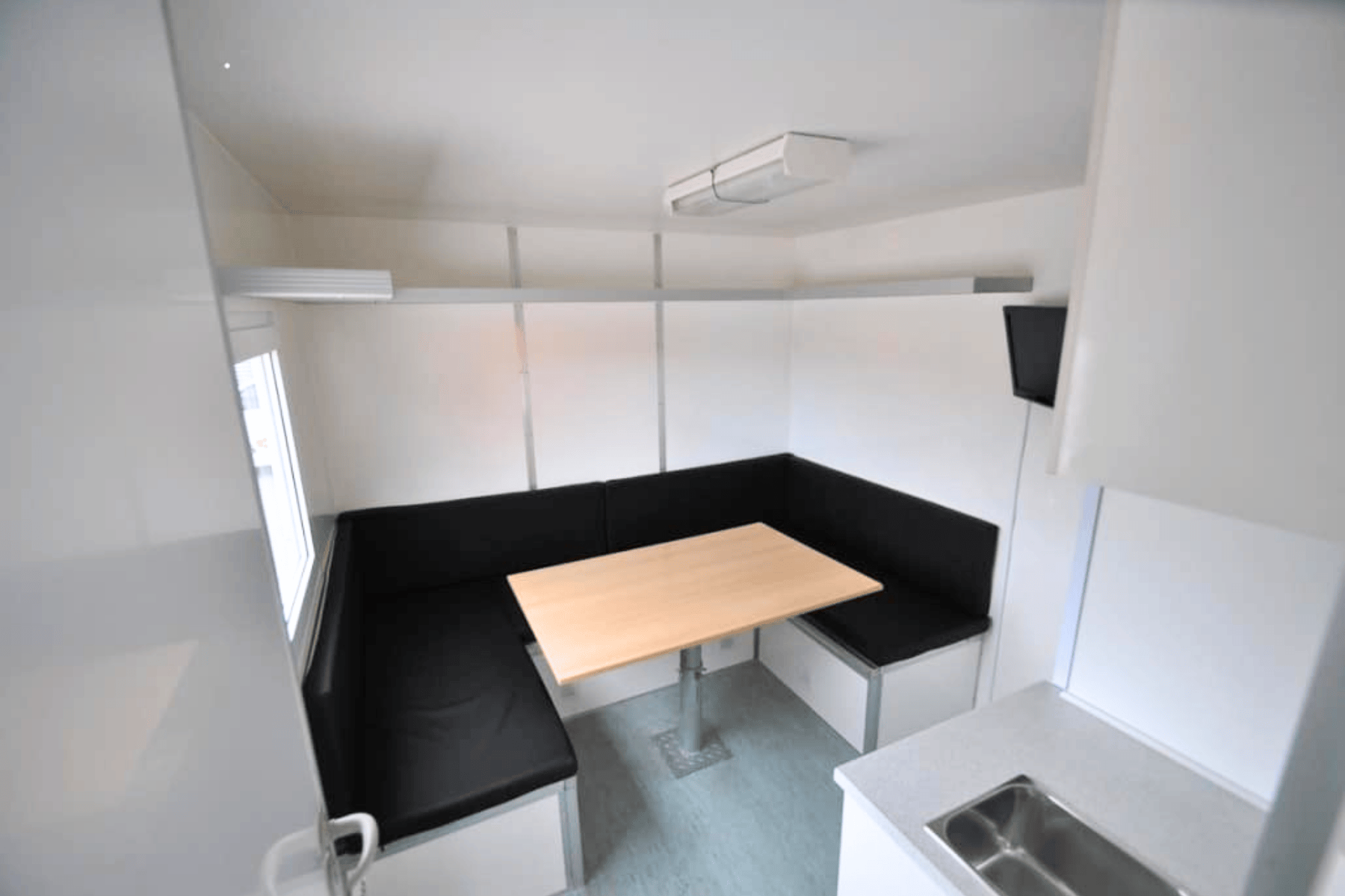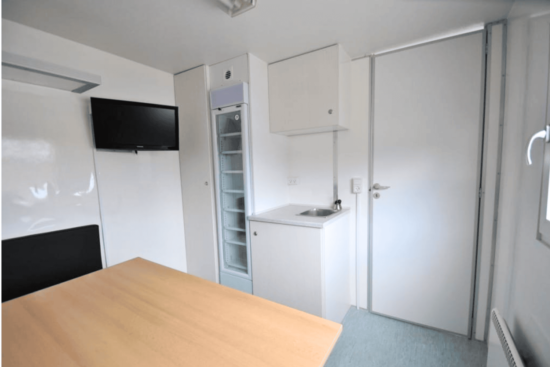 Køkkenhøjskab, flaskekøler, kaffemaskine, mikroovn, vask med afløbskværn, 1 affaldsspand, hjørnesofa/dobbeltseng, tv.