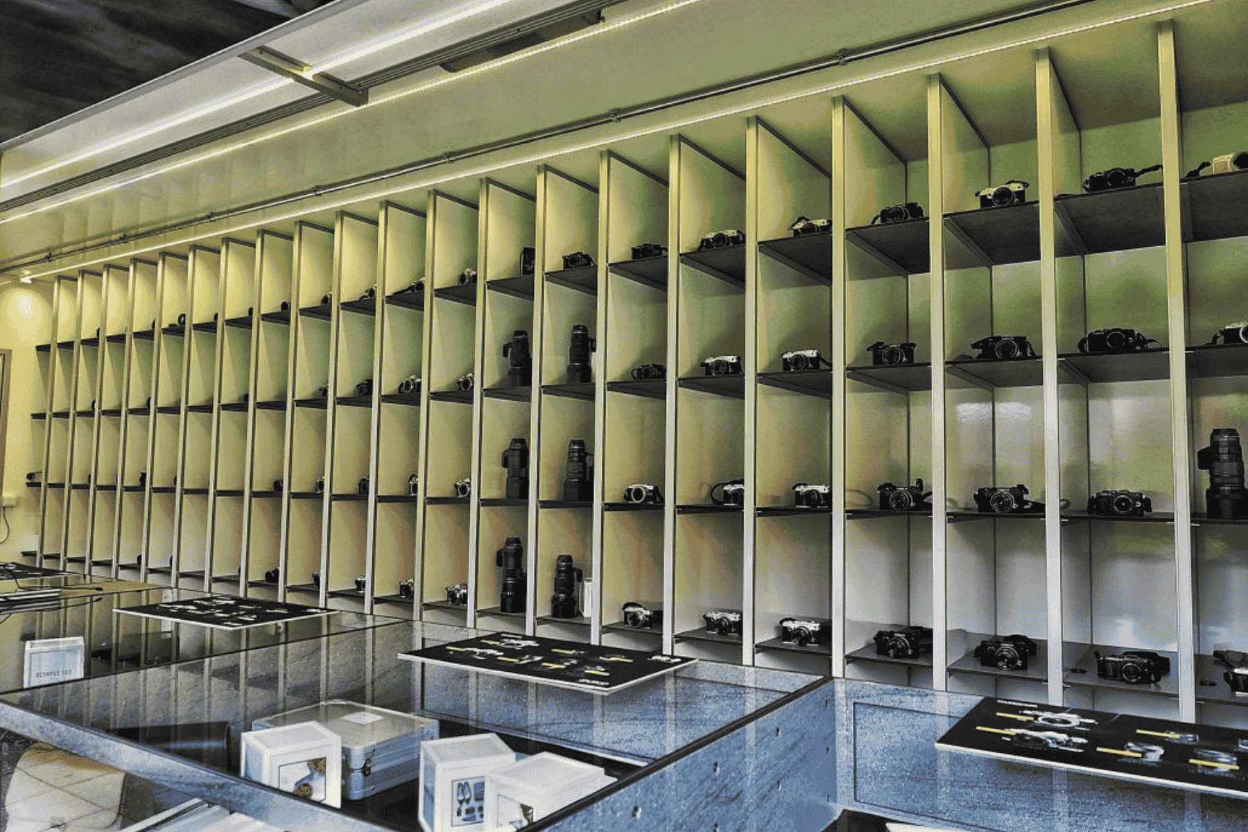 2 salgsluger med disk, hylde over disk med LED lys, bagvæg med reol for merchandise, udskydelige displaydiske i glas, loft monteret med 20 giner og 2 rækker LED lys, dør med kodelås, topskilt med LED lys beregnet for påsætning af let aftagelig folie,