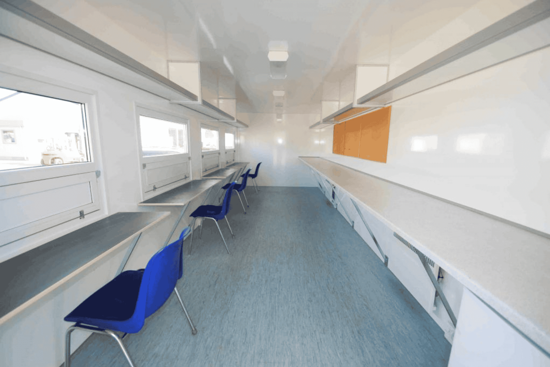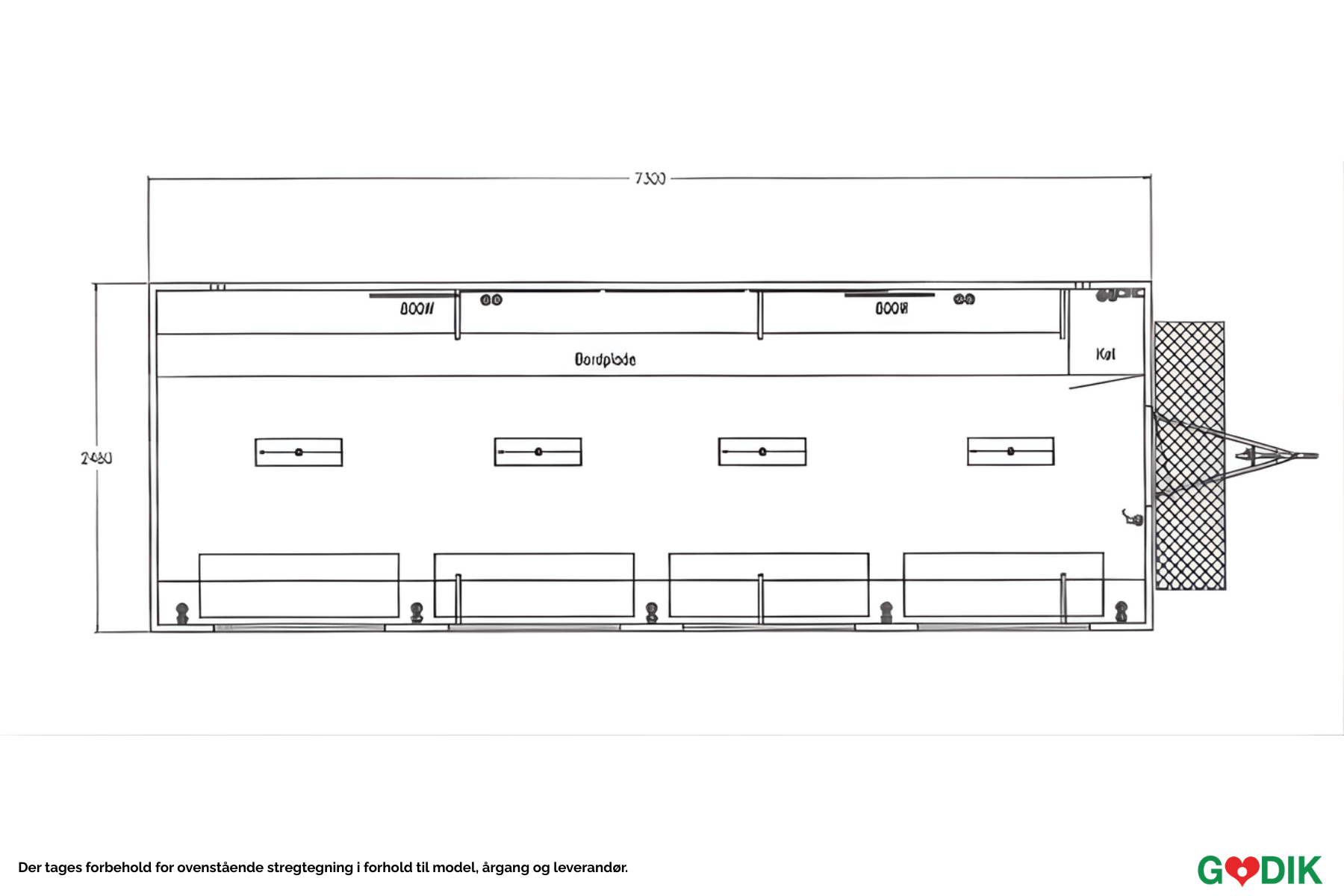 Billetvogn med 4 salgsluger, 2 stk. 800W radiatorer, 4 stole, køleskab, hylder på langvæg.