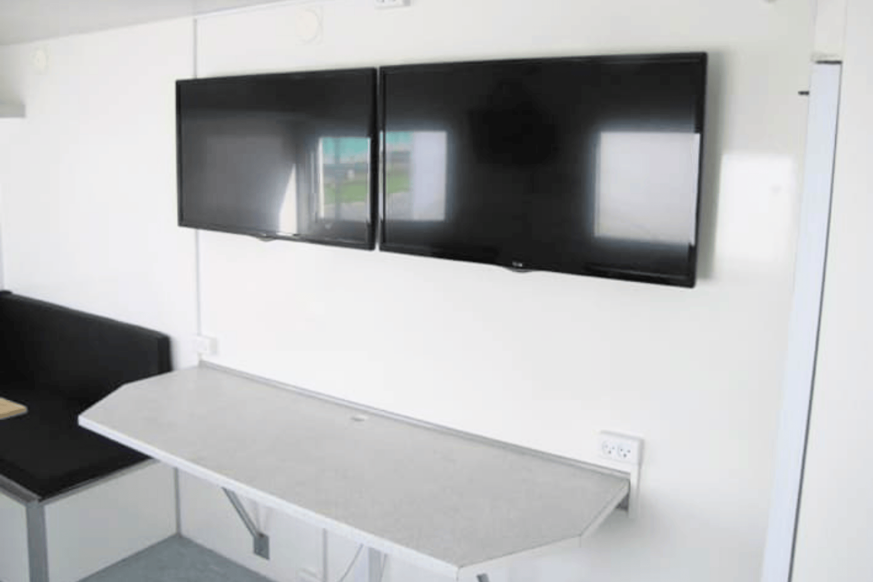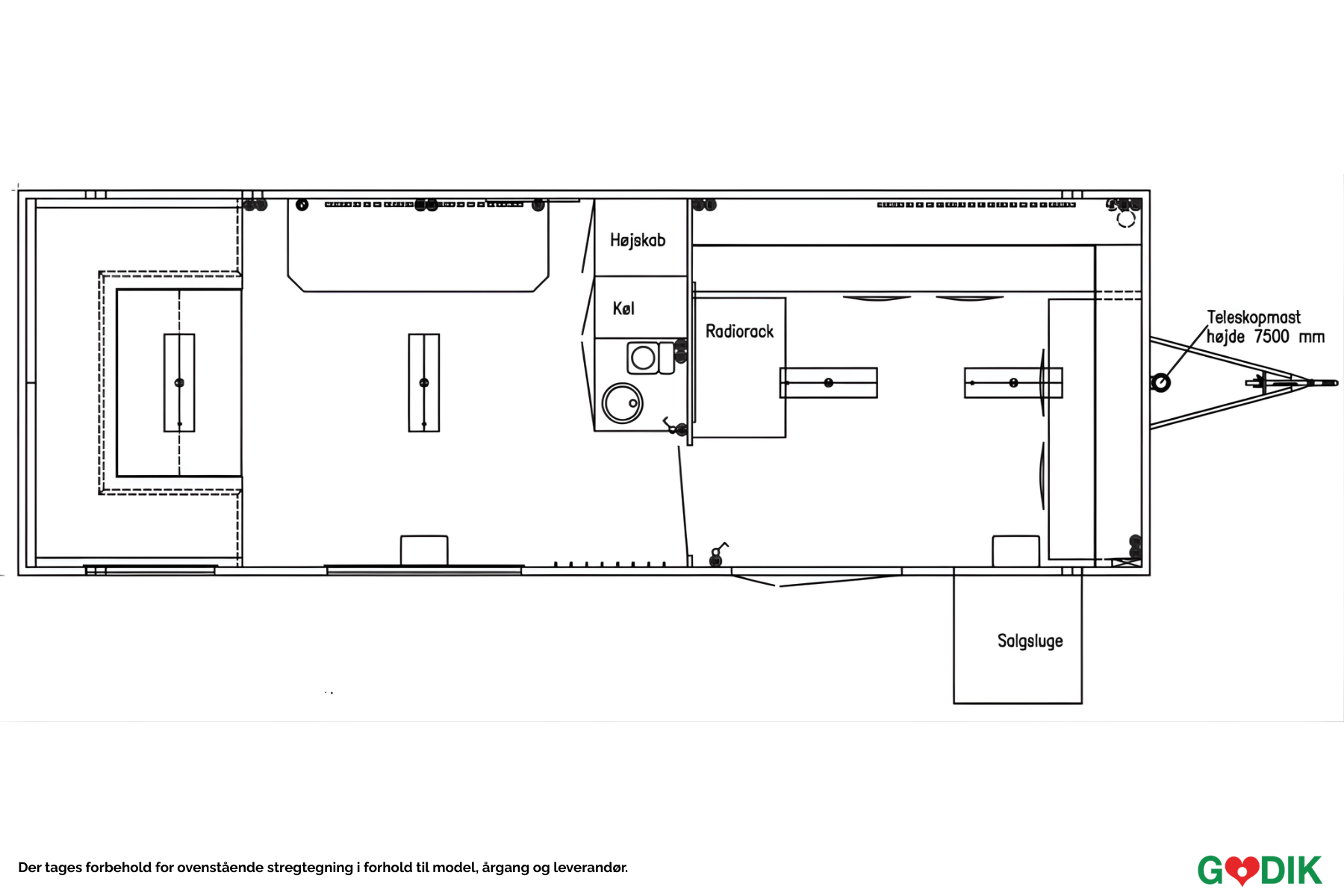 Køkkenhøjskab, flaskekøler, kaffemaskine, mikroovn, vask m/ afløbskværn, skrivebord, 3 stole, affaldsspand, hjørnesofa, dobbeltseng, 2 stk. 42" skærme, tv. Vognen er forberedt til kamera- og GPS digital radioovervågning.