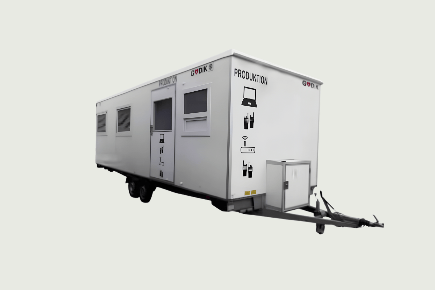 En komplet produktionsvogn indrettet til sikkerheds- og overvågningsopgaver, klargjort til kamera- og GPS-overvågning. Med kontor, køkken, sofagruppe og område til udlevering af radioudstyr fungerer vognen som et fuldt udstyret basecamp-kontrolrum – med plads til både arbejde, koordinering og drift.