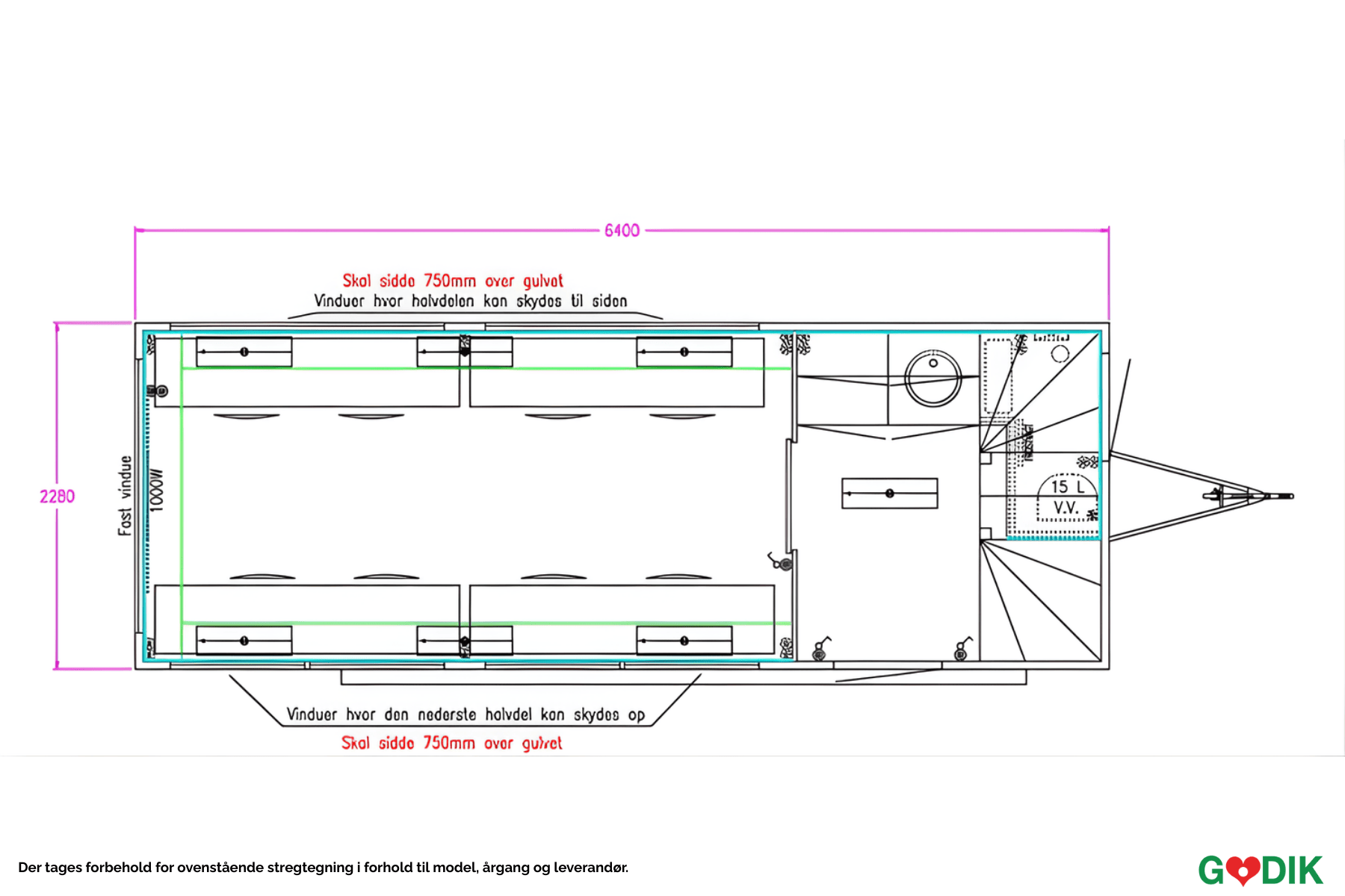 Underetage: 8 stole, ca. 8 m arbejdsbord, skydevinduer, billetluger med rullegardin, tekøkken med køleskab, overskab, knage, lysdæmper på lys, hylder over vinduer, indvendig trappe. 1. sal: 9 stole, ca. 10 m arbejdsbord, lysdæmper på lys, skydevinduer med rullegardin, 12 m ståbord. Forberedt for kabeltræk i 100 mm rør fra under- til overetage. Hejs af 1. sal: elektrisk, 12V.