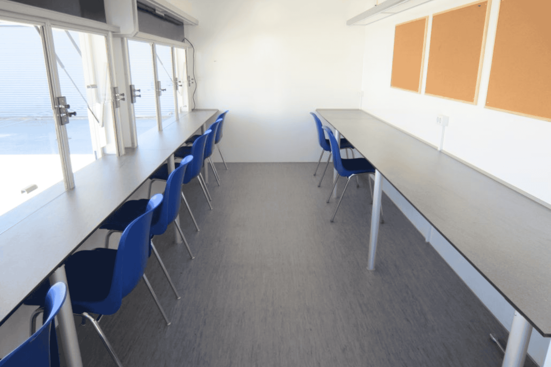 Billet/infovogn med 6 stole, borde, opslagstavle, køleskab, hylder på langvæg, trappe, håndsving, radiator. Bemærk: uden LED lys.