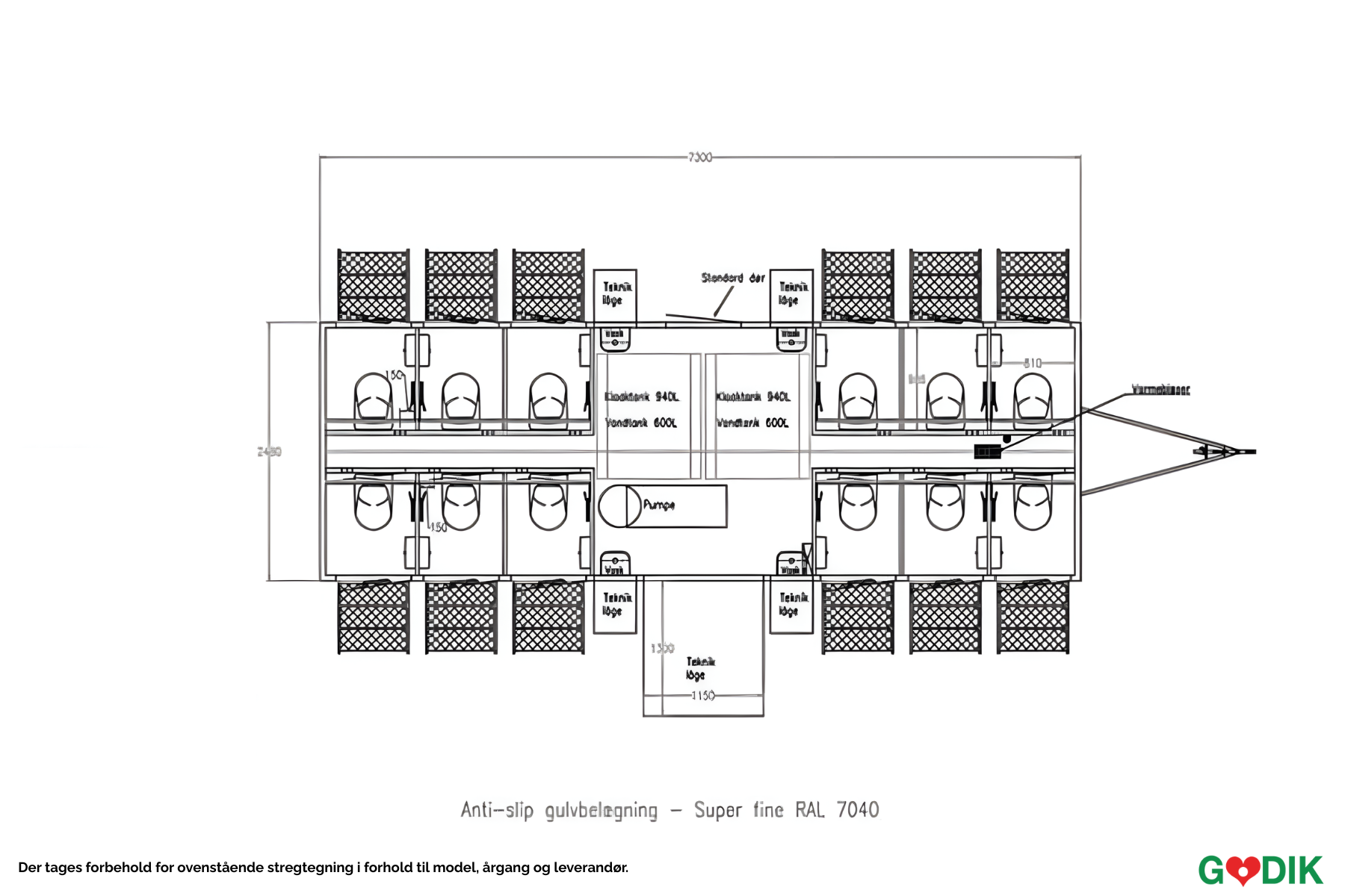 Toiletvogn m. tank med 12 vacuum toiletter. Tankkapacitet til cirka 2000 besøg. Kapacitet på cirka 300 besøg i timen