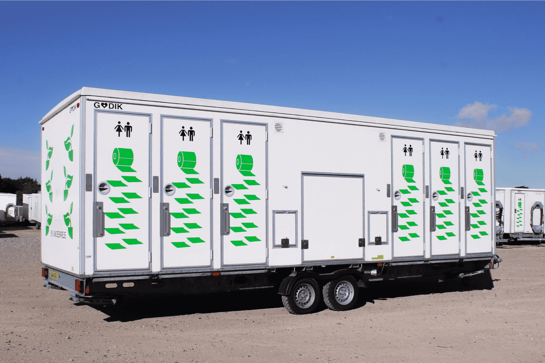 Vacuum toiletvogn med 12 toiletter og fire håndvaske på ydersiden. Designet til høj kapacitet og god hygiejne ved større events. Godik leverer, opstiller og servicerer for en problemfri drift.